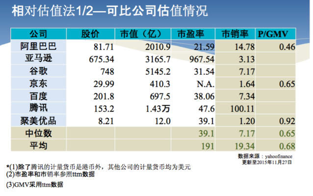 拋開理念和定性的分析,新美大(CIP)吸引潛伏投資方的故事是:未來新美大(CIP)的估值或市值還有非常大的增長空間,可以讓投資人高價退出。新美大(CIP)對標了阿里、京東、聚美等公司,用了市銷率(P/S)和P/GMV兩種估值模型。