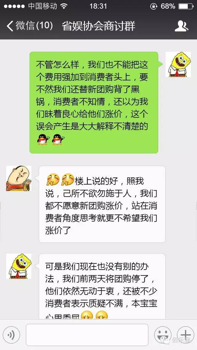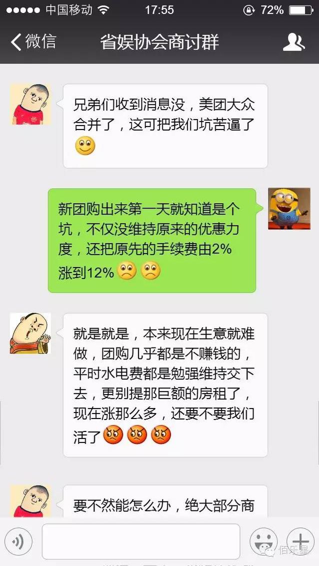 動(dòng)靜是從一個(gè)名為“省娛協(xié)會(huì)商討群”的微信聊天截圖爆出來(lái)的,當(dāng)事者為武漢KTV商家表示,新美大合并后,將原來(lái)的手續(xù)費(fèi)由2%漲到12%,商家在討論群里集體表示,在團(tuán)購(gòu)的影響下,業(yè)務(wù)利潤(rùn)已經(jīng)很低了,再多收取抽成點(diǎn),獲得收益甚至不足以支撐基本糊口。