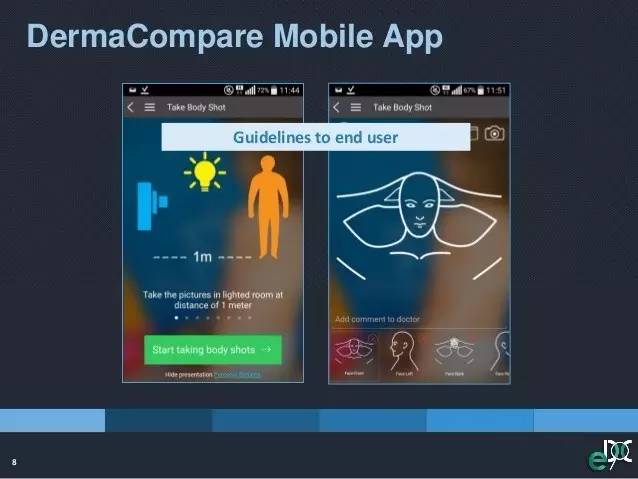 「DermaCompare 這款應(yīng)用可以讓患者通過簡樸數(shù)字?jǐn)z像頭拍攝的『全身攝影(TBP)』,進(jìn)行自我皮膚檢查。」Wayne說道。用戶可以自行下載應(yīng)用和解釋說明到任何帶有數(shù)字?jǐn)z像頭的設(shè)備上。 Wayne 解釋說,一旦病人將他或她的「全身攝影」圖像上傳到他們在 DermaCompare 云服務(wù)器的私有文件,以便存儲和預(yù)覽,那么,DermaCompare 平臺就會(1)將圖像與病人文件中的任意歷史圖像進(jìn)行比對,同時也和公司數(shù)據(jù)庫相關(guān)的圖像進(jìn)行比對;(2)更新病人的文件,創(chuàng)建一個數(shù)據(jù)要點摘要,列出和病人皮膚圖像緊急相關(guān)的數(shù)據(jù),以及任何可疑的圖像變化的預(yù)警信息;(3)通知相關(guān)醫(yī)生獲取、審視打印好的病人的數(shù)據(jù)圖表和全身攝影圖像。它會自動地匹配云服務(wù)器中五千萬種已知痣斑圖像以及病人的歷史圖像。這項技術(shù)極大地增強了醫(yī)生檢測玄色素瘤的精準(zhǔn)度和速度。
