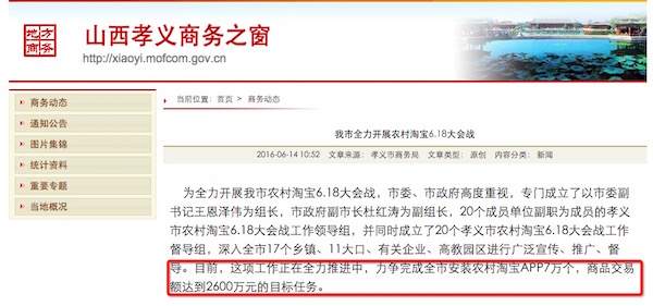 當(dāng)前,競(jìng)爭(zhēng)日趨慘烈的“6.18”大戰(zhàn)終于落下帷幕,各大電商平臺(tái)紛紛曬出自己的“成績(jī)單”。根據(jù)農(nóng)村淘寶宣布的數(shù)據(jù),家電類產(chǎn)品在今年618期間銷量最佳,農(nóng)村淘寶好像已儼然成為家電數(shù)碼產(chǎn)品下鄉(xiāng)的主陣地。 然而,在阿里村淘看似繁榮的營(yíng)銷數(shù)據(jù)背后,卻躲藏著行政干涉干與這只怪手。據(jù)傳,山西孝義市近期就發(fā)布了一份令人咋舌的文件,要求下級(jí)單位配合完成阿里村淘6.18交易額等指標(biāo)。 一、為推進(jìn)阿里村淘項(xiàng)目,孝義市強(qiáng)制向下攤派消費(fèi)指標(biāo) 日前,網(wǎng)絡(luò)上曝出一份山西省孝義市電子商務(wù)領(lǐng)導(dǎo)小組下發(fā)的紅頭文件,引來網(wǎng)友的廣泛關(guān)注和吐槽。文件內(nèi)容顯示,該市要求下級(jí)單位完成農(nóng)村淘寶在6.18期間的APP安裝量和交易額指標(biāo)。 詳細(xì)來看,孝義市擬定在2016年6月1日至19日期間,完成“安裝綁定農(nóng)村淘寶APP 7萬個(gè),商品交易額達(dá)到2600萬元”的目標(biāo)任務(wù)。為此,孝義市將指標(biāo)細(xì)化后,對(duì)市委、宣傳部等機(jī)關(guān)及企事業(yè)單位下發(fā)了明確的任務(wù)指標(biāo),甚至轄下的各鄉(xiāng)鎮(zhèn)、礦區(qū)和學(xué)校都被分配了上百、上千的APPA綁定任務(wù)。 同時(shí),孝義市要求各鄉(xiāng)鎮(zhèn)、街道和市直有關(guān)單位分別進(jìn)行一條龍排隊(duì),考核成績(jī)納入年終責(zé)任制考核?己艘劳邪⒗锇桶凸緸榇髸(huì)戰(zhàn)工作領(lǐng)導(dǎo)組組長(zhǎng)、副組長(zhǎng)、辦公室主任分別安裝后臺(tái)APP治理系統(tǒng),隨時(shí)把握各單位任務(wù)目標(biāo)完成情況。