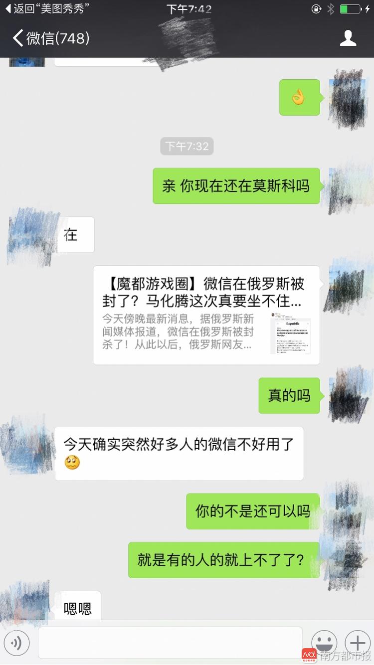 在剛剛,南都記者多方承認(rèn),微信在俄羅斯境內(nèi)被封殺。有多名居住在俄羅斯的人士向南都記者表明,從今天下午開端,俄羅斯境內(nèi)不少微信用戶呈現(xiàn)徹底無法登入、運用的狀況。有用戶則表明,微信從今天下午開端間隙性“宕機”,時好時壞。 微信方面剛才也向南都記者承認(rèn)了這一現(xiàn)實,至于詳細(xì)因素,還有待微信方面進一步的音訊。 南都記者與俄羅斯人士對話:下午開端網(wǎng)友陸續(xù)無法運用微信 ![]() ![]() ![]() 俄羅斯網(wǎng)友改用QQ交流: ![]() |