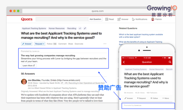 可是他們直到 2016 年 3 月,月活用戶到達(dá) 1 億時(shí),才正式開端上線廣告投進(jìn)。時(shí)刻跨度將近3年,情緒依然十分慎重。開端的廣告只會(huì)在極少數(shù)發(fā)問頁(yè)面呈現(xiàn),廣告信息也會(huì)通過(guò)各種精挑細(xì)選。而且最開端還只與 4 家廣告客戶協(xié)作——Lever、Uber、Wealthfront 和 Sunrun。
