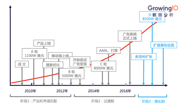 Sean Ellis,在2010年最早提出Growth Hacker的概念,他先后效勞于多家硅谷創(chuàng)業(yè)公司并協(xié)助 Dropbox 完結(jié)了年500%的添加。Sean Ellis 以為一家成功的創(chuàng)業(yè)公司必定先后閱歷三個(gè)期間:Product / Market Fit(商品和商場(chǎng)匹配期)、Transition to Growth(過(guò)渡期)、Growth(添加期)。 SocialCam 失利的地方就在于前期商品還沒有和商場(chǎng)匹配就開端大規(guī)模擴(kuò)大之路,就像房子地基沒做好就開端蓋樓,失利是必定的。 回到咱們今天的主角 Quora ,它前期的添加速度遠(yuǎn)遠(yuǎn)沒有 SocialCam 那么冷艷,可是一向穩(wěn)定添加。那么八年來(lái),Quora 是如何一步一步走過(guò)來(lái)的呢? 二、Quora 的添加黑客之旅 正如上面的創(chuàng)業(yè)金字塔模型,Quora 的添加進(jìn)程能夠分為明顯的三個(gè)期間。 (一)商品和商場(chǎng)匹配期Quora 在融資方面的表現(xiàn)十分奇特,商品上線前 3個(gè)月就取得了 1100 萬(wàn)美元的 A 輪融資,估值 8600萬(wàn)美元。這不只得益于創(chuàng)始人自身的明星效應(yīng)(他是 Facebook 的首任CTO),更是由于 Quora 對(duì)商場(chǎng)的定位十分精確,他們的中心價(jià)值點(diǎn)即是高質(zhì)量的內(nèi)容。