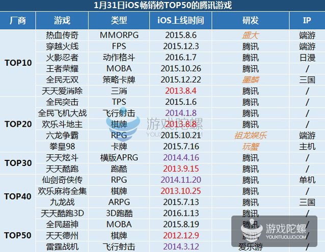 (僅統(tǒng)計(jì)2016年1月31日App Store當(dāng)天暢銷榜,騰訊發(fā)行游戲排名) 實(shí)在我們結(jié)合這幾年的騰訊手游發(fā)行情況,騰訊的主要策略仍是獲取用戶為主,由于在之前幾年中渠道擁有很大的上風(fēng)。騰訊70%的產(chǎn)品都是基于大品類籠蓋,包括跑酷、飛行射擊。但跟著人口紅利上風(fēng)衰減,用戶不斷成熟,渠道已經(jīng)不能決定用戶選擇游戲的方向,游戲本身的質(zhì)量已經(jīng)越來越重要,越來越多的用戶開始有了明確需求。細(xì)分市場,垂直用戶以及精品產(chǎn)品成為了騰訊的基本打法,這一策略也被市場所驗(yàn)證。不外手游生命周期的題目,依舊困擾著所有從業(yè)者,如何延長?最靠譜的方式仍是MMO,這個(gè)被端游、頁游市場驗(yàn)證過的形式。不光騰訊,2016年所有的大廠都往這個(gè)方向靠攏。 2015年騰訊發(fā)行的重點(diǎn)產(chǎn)品已經(jīng)集中在了重度類型,當(dāng)然騰訊內(nèi)部的分類沒有輕、中、重,而是按類型分,以這個(gè)尺度看:卡牌、休閑、MOBA、FPS四類為主。IP類產(chǎn)品在騰訊2015的手游中表現(xiàn)十分凸起。但顯然騰訊還有大量的IP產(chǎn)品和來自合作CP的產(chǎn)品。