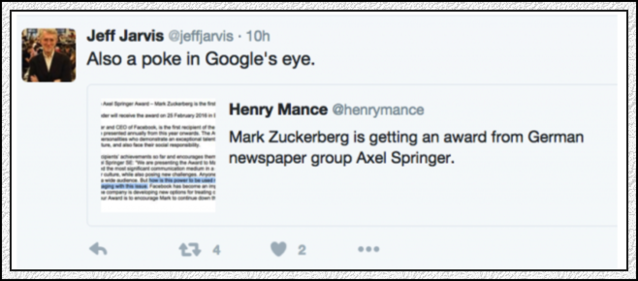 【圖說:在谷歌陣營的人看來,這場流動來者不善。聞名的親谷歌學者杰夫·杰維斯開玩笑說:這不是戳谷歌的眼睛嗎!】 谷歌是傳統(tǒng)媒體的敵人,臉書也是。不外,此一時,彼一時,合縱聯(lián)橫的政治婚姻、神圣聯(lián)盟隨時都會泛起。傳統(tǒng)媒體指望通過這樣的借力使力,在縫隙間生存,讓自己借機發(fā)展壯大,是一廂情愿的。但是,傳統(tǒng)媒體的確不能關起來門來自娛自樂,孤芳自賞,必需與狼共舞,踩著高科技的節(jié)奏飛上一會。 此外,高科技巨頭們對于新聞業(yè)發(fā)展的貢獻,也是無法無視的,事實上,后人們在撰寫新聞史的時候,谷歌、臉書這些門外的野蠻人將成為當然的主角,全球各地精英新聞學院出身的精英專業(yè)人士,從來不是新聞史臺面上確當然主角,也永遠不會是(很殘酷,是不是?但符合顛覆者不來自內(nèi)部的鐵律)。施普林格把第一個施普林格獎頒給小扎,小扎當之無愧。而那個沒有泛起在頒獎儀式上助興的谷歌,假如馬塞亞斯·多夫納足夠大度的話,同樣應該在某年授與其一個大獎。由于,谷歌對于新聞業(yè)的發(fā)展作出的貢獻,比臉書早,迄今為止,也一點不比臉書小。當然,谷歌對于新聞業(yè)的轔轢與臉書一樣,怎么評估都不會過份。 歷史,不都是以這樣的方式寫就的嗎? 稍等,新聞業(yè)(journalism)這個詞在有了谷歌與臉書之后,是不是需要重新定義了?在中國,有了早年的新浪、網(wǎng)易、搜孤,稍后的 BAT 之后,是不是也需要重新定義了?新聞早就不是原來的那個新聞,新聞業(yè)也早就不再是早先的那個新聞業(yè)了。