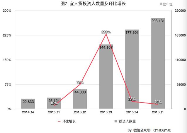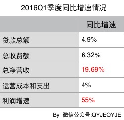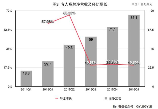 圖中紅框部門顯示,在Q2季度,Deferred revenue(遞延收入)和Cash revenue泛起失常,不遵循相關(guān)會計配比原則。 而風(fēng)險預(yù)備金項(xiàng),基本維持在總收費(fèi)額的30%左右,符合配比原則。 (遞延收入,是暫時未確認(rèn)的收益意思,由權(quán)責(zé)發(fā)生制和收付實(shí)現(xiàn)制的暫時性差異產(chǎn)生)。 因此,我們發(fā)現(xiàn)了秘密所在:宜人貸通過調(diào)整遞延收入確認(rèn)時間以及人為控制的現(xiàn)金激勵,調(diào)整了會計利潤,以符合相關(guān)上市要求。 這也解釋了,為什么凈利潤和總凈營收,會在Q2季度泛起意外不符合相關(guān)會計規(guī)律的現(xiàn)象。 在以后解讀宜人貸財報,這兩個數(shù)據(jù),將是考驗(yàn)利潤“含金量”相對有效的地方。 在2016Q1季度,同比增速情況如下: