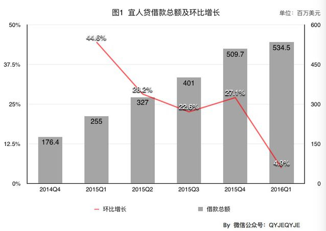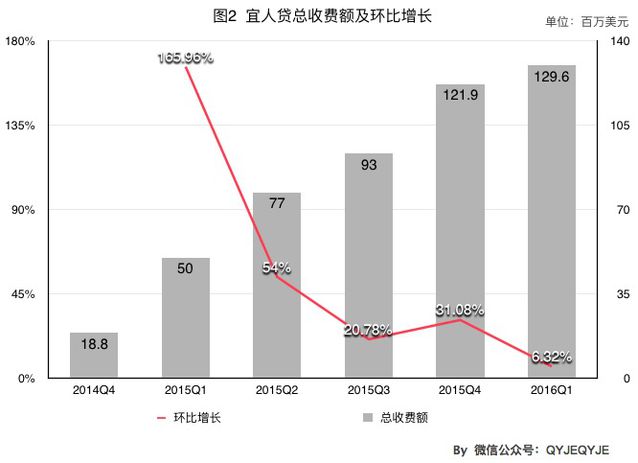 近期,跟著P2P標(biāo)桿Lending Club的隕落,股價斷崖式暴跌,9年的co-founder and CEO被逐出公司,fintech概念從神壇走下; 美國財政部隨后于5月10日發(fā)布網(wǎng)貸白皮書,題為“網(wǎng)絡(luò)市場化信貸的機(jī)遇與挑戰(zhàn)”(Opportunities and Challenges in Online Marketplace Lending),闡述對行業(yè)擔(dān)憂,政策風(fēng)口一再走緊; 雪上加霜的是,Google也于昨天晚間公布“下架小貸廣告”,成為壓垮美帝網(wǎng)貸的最后一根稻草,行業(yè)遠(yuǎn)景堪憂。 而與此同時,大西洋彼岸擁有中國特色的P2P公司——宜人貸,高調(diào)發(fā)布了自己2016年Q1季度財報,華麗的數(shù)字,使得股價也應(yīng)聲上漲5.83%。 本文將圍繞這一季財報,展開分析,探討財報數(shù)字背后,這家P2P公司詳細(xì)的發(fā)展情況。 財務(wù)業(yè)績分析 看點(diǎn)一:借款總額、總收費(fèi)額,持續(xù)增長;環(huán)比增長,駛?cè)肼嚨?/strong> 先來看每季度借款總額變化情況,如下圖1