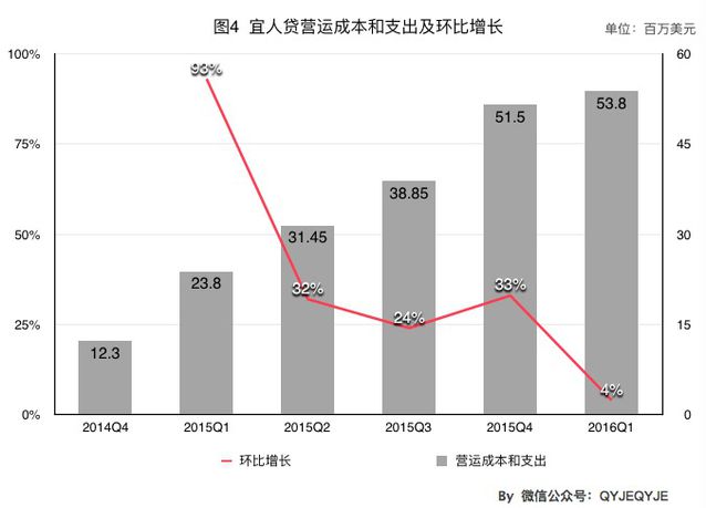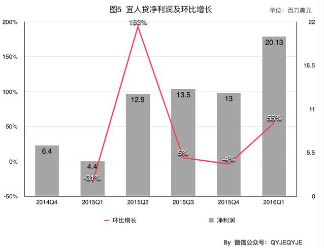 (注:總收費(fèi)額,意思毛收入總額,有兩個來源部門,一是來自借錢的人,另一部門來自投資的人,其中借錢的人,占大頭。也即從事中介借貸服務(wù),兩端收取的手續(xù)費(fèi),為其所有收入) 然而這樣一種變化趨勢,無疑是難以讓資本市場滿足的。 對于各家P2P平臺而言,平臺的借款總額,就猶如電商行業(yè)的GMV,體量和增速對公司在資本市場估值尤為致命。 作為一家奔跑著的創(chuàng)業(yè)公司,它的環(huán)比增長速度,卻泛起大幅度下滑。這是一個非常致命的信號。 假如后期發(fā)展增速繼承疲軟,那么華爾街將改變對其估值模型:由高速成長模型轉(zhuǎn)變?yōu)槌墒炀徛l(fā)展模型。 公司發(fā)展速度,回到社會資本均勻增長水準(zhǔn);股價也回調(diào)至緩慢上漲。 當(dāng)然,下一階段考慮到?jīng)]有了春節(jié)這個季節(jié)因素影響,個人以為存在一定的止跌可能; 然而,對于最近這段時間美國嚴(yán)肅的監(jiān)管立場,LC丑聞、海內(nèi)糟糕的投資環(huán)境,2016Q2季度的表現(xiàn),應(yīng)該不會比Q1季度好到哪里去。 對于資本市場而言,宜人貸發(fā)展遠(yuǎn)景、想象力確實(shí)十分有限,股價不會泛起大幅上揚(yáng)。 看點(diǎn)二:凈利潤表現(xiàn)搶眼,原來是存在很顯著的“操作利潤”情況