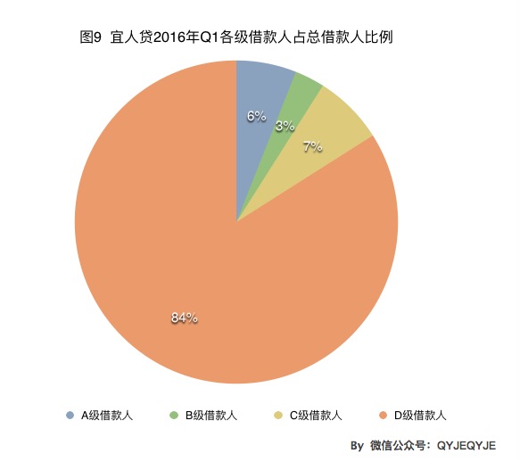 趨勢很顯著,宜人貸在2015Q4季度后,對于借款人以及標(biāo)的來源,有意識的降低要求,減輕對線下的資源依靠。其中,還專門表露了Q1季度,來自移動借款真?zhèn)數(shù)據(jù)32.8%,PC端數(shù)據(jù)為55%,合計線上88%。 對于投資人方面,宜人貸已經(jīng)于2015Q4季度,全部實(shí)現(xiàn)了線上。目前投資資金全部來自線上,沒有通過線下交易。 說明其逐漸實(shí)現(xiàn)了網(wǎng)絡(luò)借貸本身的含義。 壞賬情況分析 看點(diǎn)五:刀尖上嗜血,風(fēng)險加大 宜人貸把客戶分為ABCD四類,A類信用最高,D類信用最差。下圖是借款利率情況: