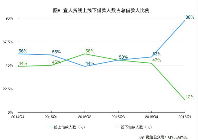 在2015Q3季度,投資者人數(shù),大幅度增加。個人以為有兩點(diǎn)原因: √、投資人數(shù)、變化趨勢,在IPO定價方面,影響權(quán)重巨大,所以宜信團(tuán)體,把部門線下客戶互聯(lián)網(wǎng)化,予以“輸血”;除此之外,宜人貸做了相應(yīng)大規(guī)模的營銷獲客行為; √、2015年6月18后的股災(zāi)緊密親密相關(guān),受傷的投資人,需要理財投資渠道,部門投資人,選了投資P2P網(wǎng)貸。 客戶變遷分析 看點(diǎn)四:掙脫線下依靠,線上交易成體系、移動端有了新進(jìn)展