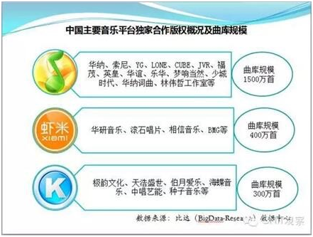 事實(shí)上,一張數(shù)字專輯的銷量可以反映出一家音樂平臺(tái)的多個(gè)方面。好比,首先可以反映出的是一家音樂平臺(tái)的人氣和用戶規(guī)模。從上述對(duì)比不丟臉出,QQ音樂顯然比酷狗擁有更為旺盛的人氣和更大的用戶規(guī)模。其次,也反映出一家音樂平臺(tái)的營(yíng)銷力,銷售數(shù)字單曲與網(wǎng)友自行收聽免費(fèi)單曲是完全不同的用戶行為,從上述對(duì)比來看,QQ用戶的活躍度和消費(fèi)能力更高,而酷狗區(qū)區(qū)不足5萬的銷量則反映出了酷狗這家音樂平臺(tái)用戶活躍度和消費(fèi)能力的不足。 實(shí)際上,之所以有這樣的懸殊,主要還在于一家音樂平臺(tái)是否能獲得大牌本身的認(rèn)可和資源整合能力。以張杰為例,與老東家天娛解約后,張杰的新專輯與福茂唱片展開戰(zhàn)略合作,開啟個(gè)人“我想”音樂計(jì)劃。而作為福茂唱片的獨(dú)家版權(quán)合作伙伴,張杰入駐福茂后也獨(dú)家牽手QQ音樂,成為平臺(tái)上又一閃亮的巨星,騰訊公司副總裁彭迦信先生曾在發(fā)布會(huì)現(xiàn)場(chǎng)宣布了張杰首張數(shù)字單曲的預(yù)售成績(jī),最新單曲《我想》僅預(yù)售48小時(shí)就達(dá)50萬白金銷量,創(chuàng)造未正式上線就破白金銷量的新紀(jì)錄,白金唱片認(rèn)證也成為QQ音樂送給張杰全新啟航最好的見面禮,而正式上線僅兩天總銷量突破70萬,音樂價(jià)值得到充分彰顯。 數(shù)據(jù)顯示,作為中國(guó)數(shù)字專輯發(fā)行序幕的開啟者,從2014年底周杰倫的《哎呦,不錯(cuò)哦》開始到2015年,QQ音樂平臺(tái)共計(jì)為近20位歌手發(fā)行共近30張數(shù)字專輯,從首創(chuàng)巨星周杰倫到新偶像鹿晗,再到韓國(guó)天團(tuán)BIGBANG、歐美天后Rihanna,僅一年時(shí)間數(shù)字專輯總銷量突破1000萬張,鹿晗和BIGBANG、Rihanna等銷量屢破百萬張銷量紀(jì)錄,QQ音樂此舉也被以為,標(biāo)志著中國(guó)數(shù)字音樂時(shí)代的正式來臨。 而反觀酷狗,在數(shù)字專輯和數(shù)字單曲的發(fā)行力和營(yíng)銷力上仍是力不從心的。 版權(quán)危機(jī) 版權(quán)是一家音樂平臺(tái)的立命之本,用無版權(quán)不音樂來形容亦不為過。目前主要平臺(tái)音樂版權(quán)及曲庫(kù)貯備情況可以從下圖中一探畢竟: