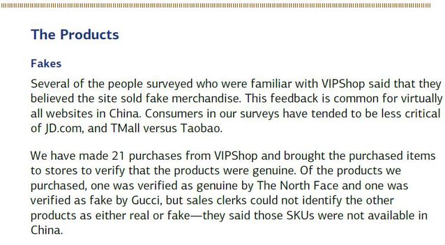 對于閃購模式的唯品會而言,品牌在劃定的時間內(nèi)上新,通過折扣的方式,來刺激消費者快速決議計劃購買。在唯品會的首頁上,每個品牌上新的位置都很有限,也都意味著巨大的利益牽扯。一位曾上過唯品會的商家透露,唯品會在招商控制上層層審批,但想上唯品會(特別是首頁)的品牌商趨之若鶩。即便治理上很嚴(yán)格,但仍是避免不了一些“潛規(guī)則”。 事實上,聯(lián)系關(guān)系交易本身并不違法,根據(jù)SEC的要求,與上市公司產(chǎn)生聯(lián)系關(guān)系交易的行為必需要對外表露。這也是考慮到,聯(lián)系關(guān)系交易方可以運用行政氣力撮合交易的進行,從而有可能使交易的價格、方式等在非競爭的前提下泛起不公正情況,形成對股東或部門股東權(quán)益的侵犯,也易導(dǎo)致債權(quán)人利益受到損害。 售賣未經(jīng)品牌商授權(quán)的商品 贗品對于電商來說,是一個“惡疾”。JCAP講演中夸大,調(diào)查了多位消費者,均表示在唯品會上買到過贗品。 JCAP調(diào)查職員抽選了21個調(diào)查樣本,去品牌商的線下實體店驗貨,其中樣本中的Gucci被證明為贗品,其余的商品樣本,銷售職員也無法辨明真?zhèn)巍?ldquo;這些商品的型號并沒有在中國銷售。”