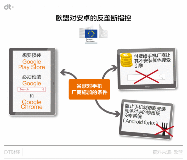 實(shí)在,一開始?xì)W盟成立調(diào)查組,就是為了避免案件像此前的微軟反壟斷案一樣,一拖就是十多年。歐盟起初但愿可以快速找到證據(jù),對谷歌進(jìn)行懲罰。但事到如今回頭看,歐盟顯然沒能實(shí)現(xiàn)愿望,如今案件也拖了近六年,而且終極仍是要靠正式訴訟來終結(jié)糾紛。 《逐日電訊報(bào)》的報(bào)道中,也引述分析人士稱,在多年的糾纏之后,谷歌已經(jīng)不想再繼承耗費(fèi)精力財(cái)力,也打算接受罰款終止案件。 歐盟放大招,歷數(shù)谷歌安卓系統(tǒng)的三大罪狀 那么歐盟這30億的罰款,畢竟是因?yàn)楣雀璧氖裁醋餇钅兀?/p>