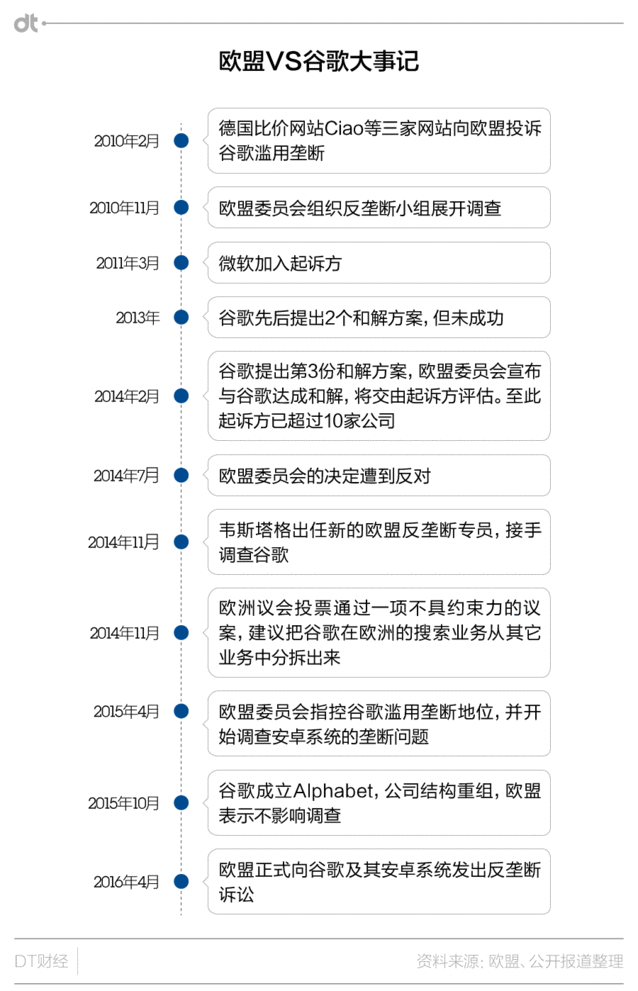 谷歌的反壟斷案,可能即將以30億罰款來終結(jié) 據(jù)英國《逐日電訊報(bào)》報(bào)道,歐盟委員會近期將公布對谷歌涉嫌壟斷的罰款數(shù)額,而這一數(shù)字可能高達(dá)破紀(jì)錄的30億歐元。而到目前為止已有的最高反壟斷罰單,是2009年對芯片制造商英特爾公司11億歐元罰款。 讓谷歌雪上加霜的是,這30億歐元恐怕還不是上限,根據(jù)相關(guān)法律,歐盟委員會最高可以對公司處以其年?duì)I業(yè)額10%的罰款。也就是說,谷歌公司面對的罰款上限將達(dá)60億歐元。 事情大概是這樣的:2010年下半年,幾家搜索及比價網(wǎng)站指控谷歌利用其搜索上風(fēng)推廣自家服務(wù),損害競爭對手利益。之后歐盟對谷歌的反壟斷調(diào)查開始,這一被形容為“史詩級”的訴訟正式拉開序幕。在之后的近6年的調(diào)查中,谷歌曾先后三次提出和解方案,但終極都被拒絕。 DT君為大家總結(jié)了這場訴訟的歷史: