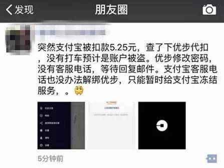 這條朋友圈的大概內(nèi)容就是,他的優(yōu)步賬號被盜刷了,而且,除了凍結(jié)支付寶,一點辦法也沒有。。。 當(dāng)然,這有可能是個個例。
