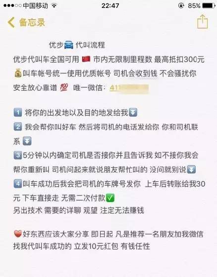 也就是說,他利用一個盜取的賬號幫你叫車,無論路程多遠(yuǎn),你只需要暗里給他 30 元,就可以拍拍屁股走人了。。而實際打車用度,就由那些被盜號的人承擔(dān)了。。。 上圖還特么宣傳了可以教你,這樣的技術(shù): 另出技術(shù),需要的詳聊,觀望,注定無法賺錢。 好東西應(yīng)該大家分享,即日起,凡是推薦一名朋友加我微信找我代叫車成功的,立發(fā) 10 元紅包,有錢率性。 (踏馬的,有錢還干這種齷齪事??)