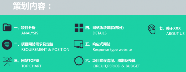 一般我們?cè)诤涂蛻粽劸W(wǎng)站開發(fā)建設(shè)項(xiàng)目的時(shí)候,對(duì)方通常都會(huì)要求我們提供一份網(wǎng)站開發(fā)建設(shè)方案。固然在項(xiàng)目接洽過(guò)程中有談到某些開發(fā)建設(shè)方面的內(nèi)容,但是一份書面的方案提供仍是很有必要的。這不僅利便于客戶更加仔細(xì)地了解我們提供的服務(wù)和開發(fā)建設(shè)流程,還有利于客戶治理層之間的項(xiàng)目溝通探討,為雙方之間的項(xiàng)目確定提供指導(dǎo)性文件。常見的方案都是以PPT形式展現(xiàn)的,PPT的好處就是展現(xiàn)形式豐碩多樣,給人的感覺直觀且信息量大,易于理解。PPT方案也可采用某些動(dòng)效展示,令某些動(dòng)作交互更加通俗易懂,客戶在閱覽過(guò)后心里也更加清晰明白。假如項(xiàng)目不大,當(dāng)然也可以使用WORD來(lái)展示,不外小編仍是推薦以PPT形式來(lái)展現(xiàn),究竟顯得高端一點(diǎn)。 針對(duì)不同的項(xiàng)目需求有不同的策劃方案,我們做出來(lái)的方案一定要貼和客戶需求來(lái)編寫,時(shí)刻捉住客戶所需,才能令這篇方案體現(xiàn)應(yīng)有的價(jià)值,而不是抄襲千篇一律的模式。沒有重點(diǎn)的方案,只會(huì)令客戶感到疑惑,得不到客戶想得到的信息,那么繼承的合作也就難以開展下去。 下面讓我們來(lái)看看詳細(xì)從何著手來(lái)寫一篇優(yōu)質(zhì)的網(wǎng)站建設(shè)策劃方案。 一、預(yù)備工作 俗話說(shuō)兵馬未動(dòng),糧草先行。我們?cè)陂_始進(jìn)行方案策劃的時(shí)候,一定要提前做好預(yù)備工作。詳細(xì)說(shuō)來(lái)就是把握客戶具體資料,包括客戶所屬行業(yè)特點(diǎn)、網(wǎng)站建設(shè)的需求、客戶對(duì)互聯(lián)網(wǎng)的認(rèn)知度等(利便方案的策劃是否要運(yùn)用專業(yè)術(shù)語(yǔ)仍是淺顯易懂的方式來(lái)編寫)。當(dāng)我們知曉這些內(nèi)容后,就可以思量接下來(lái)的方案編寫采取哪種形式來(lái)展現(xiàn)好。再者,也能讓我們的方案內(nèi)容策劃盡可能地貼近客戶、貼近需求。這一階段的預(yù)備工作是我們必需要做的,除此之外我們還要和公司技術(shù)等相關(guān)職員研討一下針對(duì)客戶的建站要求詳細(xì)是怎么部署的。我們策劃職員的角色就相稱于連接二者的橋梁,當(dāng)然要知曉雙方的信息,這樣策劃出來(lái)的方案才能合用于雙方。方案不只是客戶要看,我們內(nèi)部也要參閱的,這點(diǎn)大家需要留意。 這里順便談一點(diǎn),就是PPT要不要使用模板的題目,小編覺得使用模板沒什么不好,當(dāng)然假如能自己設(shè)計(jì)那是最好的。使用現(xiàn)成的PPT,保持版式的條件下修改里面的內(nèi)容,這是一種快速完成方案的方法。假如自己設(shè)計(jì),那么有更多的發(fā)展空間,良多圖片設(shè)計(jì)也能自定義化,適合擁有一定設(shè)計(jì)基礎(chǔ)的策劃者。自己完全獨(dú)立設(shè)計(jì)一篇策劃方案PPT,打從心里也是對(duì)自己的肯定和鼓勵(lì)。所以不用糾結(jié)用了別人的PPT模板,里面的內(nèi)容才是實(shí)質(zhì)性的干貨,是別人復(fù)制不到的精華。 二、策劃方案的編寫 開始編寫策劃方案之前,最好先列個(gè)提綱、打個(gè)草稿,就比如我們寫作文一樣。想好先寫什么、再寫什么,做到心中有數(shù),這樣編寫的方案也有一定的條理順序,便于閱讀理解。下面浪訊科技小編將自己平時(shí)的策劃步驟給大家分享一下,包括以下幾點(diǎn)。 1.首頁(yè)展示 策劃案的名稱,策劃案編寫者所屬公司等信息,可適當(dāng)添加。不要求信息量有多大,簡(jiǎn)潔明了就好。如下圖,當(dāng)然配色那些可以按照客戶行業(yè)特征或以科技公司色調(diào)為主,不要太花哨就好。 2.策劃內(nèi)容 這部門展示我們針對(duì)客戶需求所進(jìn)行的大體規(guī)劃,常見的內(nèi)容包括項(xiàng)目分析、網(wǎng)站需求及定位、網(wǎng)站TOP圖、板塊詳解、響應(yīng)式網(wǎng)站特色、項(xiàng)目建設(shè)流程周期及預(yù)算、關(guān)于我們等。詳見下圖