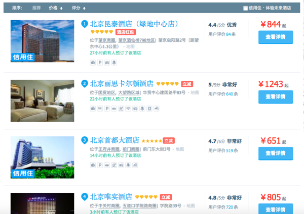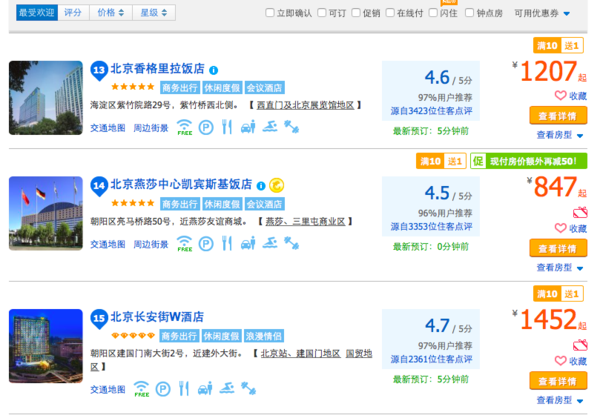 同樣以北京地區(qū)為例,在攜程的酒店頁面勾選“五星級/豪華”后,泛起的酒店以香格里拉、凱賓斯基、威斯汀、喜來登等高端連鎖酒店、以及國際飯店等單體高端酒店為主?蛦蝺r普遍在800-1500左右。