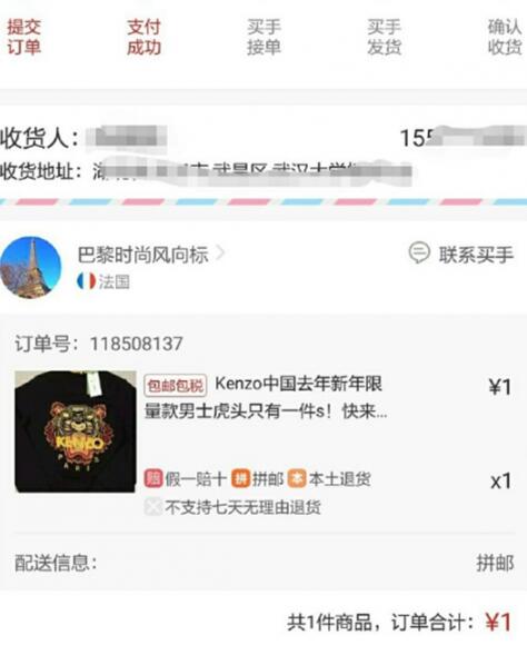 一件kenzo衛(wèi)衣讓武漢的陳同學(xué)(化名)走上了維權(quán)的道路。 11月25日,陳同學(xué)在洋碼頭“巴黎時尚風(fēng)向標(biāo)”以1元的價格搶得一件原價1599元kenzo虎頭衛(wèi)衣。誰知付款成功后,賣家卻并不愿意發(fā)貨。 為了維護(hù)自己的權(quán)益,陳同學(xué)與洋碼頭、巴黎時尚風(fēng)向標(biāo)展開一場有關(guān)消費(fèi)者權(quán)益保護(hù)的斗爭。 ![]()