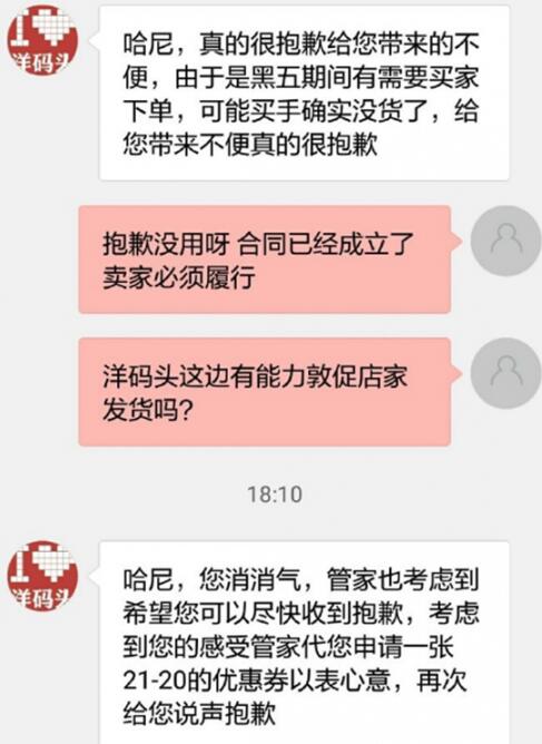 陳同學(xué)以為,買賣雙方合同已經(jīng)形成,并不是賣家說沒貨就能取消發(fā)貨的,立即拒絕了洋碼頭客服的優(yōu)惠券并請洋碼頭督促賣家發(fā)貨。 盡管有洋碼頭平臺客服參與,但賣家仍遲遲未發(fā)貨。在與洋碼頭客服進(jìn)行在線溝通以及電話溝通后,12月3日洋碼頭方面向陳同學(xué)報歉,因為陳同學(xué)所搶購的Kenzo虎頭衫為限量款,賣家沒有存貨,于是將其市場價格1500元補(bǔ)償給了陳同學(xué)。 1元搶購衛(wèi)衣成功賣家卻不發(fā)貨,最后洋碼頭補(bǔ)償了陳同學(xué)1500元。從11月25日到12月3日,由于一件衛(wèi)衣,陳同學(xué)與賣家、洋碼頭多方溝通,耗時8天,拿到1500元補(bǔ)償后的陳同學(xué)隨后將這筆錢捐給了“但愿工程一對一助學(xué)”。 賣家拒不發(fā)貨并不是個案 維權(quán)期間,陳同學(xué)在自己的個人微博具體記實著事件的進(jìn)展。很快他發(fā)現(xiàn),在今年的“玄色禮拜五”購物期間,有不少的網(wǎng)友都與他有著相同的遭遇。 據(jù)陳同學(xué)先容,有一位網(wǎng)友表示,自己同樣遭遇了搶購成功但賣家不發(fā)貨的情況。賣家甚至以“無貨”為由,要求買家取消訂單。 ![]()