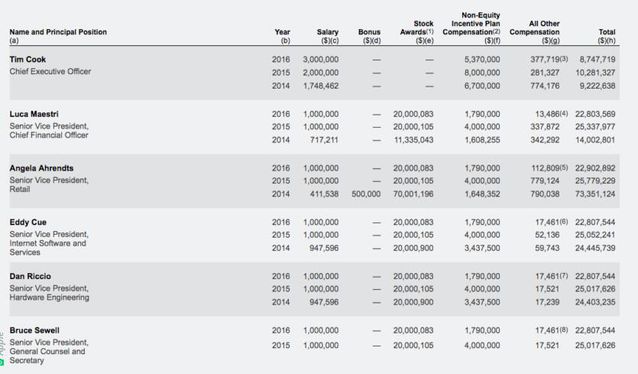 蘋果公司舉例想證實(shí)App Store在iPhone銷量下滑的情況下,應(yīng)用銷售在特定地區(qū)是增長(zhǎng)的,新游戲推動(dòng)了應(yīng)用銷售增長(zhǎng),以及用戶適應(yīng)訂閱模式愿意長(zhǎng)期支付用度。 App Store等服務(wù)業(yè)務(wù)帶來(lái)的營(yíng)收是蘋果公司上一年財(cái)報(bào)中未幾的亮點(diǎn),也是蘋果公司高管一直夸大重點(diǎn)發(fā)展的業(yè)務(wù),即便App Store營(yíng)收目前還無(wú)法撐起iPhone等硬件銷售下滑帶來(lái)的負(fù)面影響,不外增速老是讓人滿足的,并且App Store營(yíng)收相稱于純收入,這些都是可以直接計(jì)入利潤(rùn)的。 蘋果公司表示自2008年App Store面世以來(lái),開發(fā)者已經(jīng)獲得了超過(guò)600億美元收入,推導(dǎo)可知蘋果公司獲得257億美元的收入,這都是現(xiàn)金流,直接晉升利潤(rùn),股東天然滿足。 蘋果公司高管現(xiàn)金激勵(lì)減少 但他們收入主要部門是期權(quán) 蘋果公司高管接受總薪酬減少的動(dòng)靜,是SEC文件表露而恰好泛起,這是高管們對(duì)蘋果公司總營(yíng)收下滑負(fù)責(zé)的一種表現(xiàn)方式,但假如仔細(xì)研究高管們的總薪酬,大家就會(huì)明白,高管們薪酬減少的絕對(duì)值并未幾,這是由于高管們和普通員工薪酬構(gòu)成的不同。 對(duì)于美國(guó)的科技公司員工來(lái)說(shuō),薪酬包括基本薪酬(年薪)、年終獎(jiǎng)金以及期權(quán),在年薪固定或每年微漲、期權(quán)按工作時(shí)間兌現(xiàn)的情況下,年終獎(jiǎng)金會(huì)影響到總薪酬的多寡。媒體報(bào)道中不僅僅是庫(kù)克總薪酬減少,蘋果高管們的薪酬同樣受到影響,均勻整體下滑10.5%。在2016年之前的4年,由于蘋果公司年年增長(zhǎng)的業(yè)績(jī),蘋果的高管是獲得最高額的現(xiàn)金激勵(lì)的,2016年蘋果公司的總營(yíng)收和盈利都不如預(yù)期,這也影響到蘋果公司高管們的錢包,但是數(shù)據(jù)列出來(lái)后,大家就會(huì)發(fā)現(xiàn)高管們總薪酬減少的數(shù)額并未幾——對(duì)于他們2000萬(wàn)美元的總薪酬來(lái)說(shuō),對(duì)于普通員工這當(dāng)然是一大筆錢了。高管們薪酬的大頭是期權(quán),而普通員工比較正視現(xiàn)金獎(jiǎng)勵(lì),由于期權(quán)總數(shù)有限。 詳細(xì)到蘋果公司CEO庫(kù)克,他的2016年總薪酬為870萬(wàn)美元,比2015年的1030萬(wàn)美元減少160萬(wàn)美元,而這是他基本薪酬從200萬(wàn)美元增加到300萬(wàn)美元的基礎(chǔ)上,所以庫(kù)克今年拿得手的現(xiàn)金獎(jiǎng)金比去年減少263萬(wàn)美元。 SEC(美國(guó)證券交易委員會(huì))表露的蘋果公司文件顯示,蘋果公司CEO Tim Cook(蒂姆·庫(kù)克)2014財(cái)年薪酬總額為922萬(wàn)美元,是其2013財(cái)年薪酬(430萬(wàn)美元)的2.1倍,其中包括工資174萬(wàn)美元,非股權(quán)激勵(lì)薪酬670萬(wàn)美元。研究每年詳細(xì)的數(shù)據(jù)可知庫(kù)克每年的基本薪酬是在增長(zhǎng)的,分別從2014年的174萬(wàn)美元,2015年的200萬(wàn)美元到2016年的300萬(wàn)美元,確定庫(kù)克基本薪酬的就是蘋果公司薪酬委員會(huì),這個(gè)委員會(huì)也決定所有其他高管的薪酬。 對(duì)于高管來(lái)說(shuō),總薪酬比去年降低也不是良多,由于期權(quán)獎(jiǎng)勵(lì)是同樣的。他們總薪酬中的大頭恰是期權(quán)獎(jiǎng)勵(lì)。