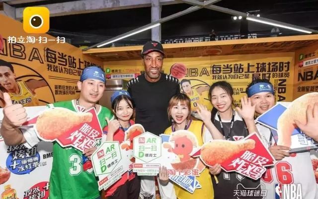 在本年NBA Hoop Party直播現(xiàn)場(chǎng),NBA巨星皮蓬出現(xiàn)在現(xiàn)場(chǎng),與他一同合影的工作人員手舉德克士的牌子,提示現(xiàn)場(chǎng)球迷運(yùn)用淘寶APP掃一掃德克士LOGO,