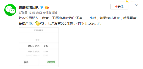 騰訊微信團(tuán)隊(duì)微博消息,本年七夕沒有520紅包。