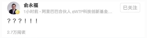就在楊偉東的新聞爆出后,外界發(fā)現(xiàn)前阿里巴巴集團(tuán)大文娛董事長俞永福發(fā)了一個(gè)狀態(tài),一個(gè)字沒寫,只有三個(gè)問號和三個(gè)感嘆號。