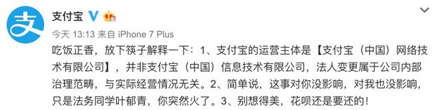 今日支付寶對外宣告,法人將從馬云變?yōu)槿~郁青。一時間引起很多網(wǎng)友的強烈反響,當中最大的聲音便是:“花唄不必還了?”