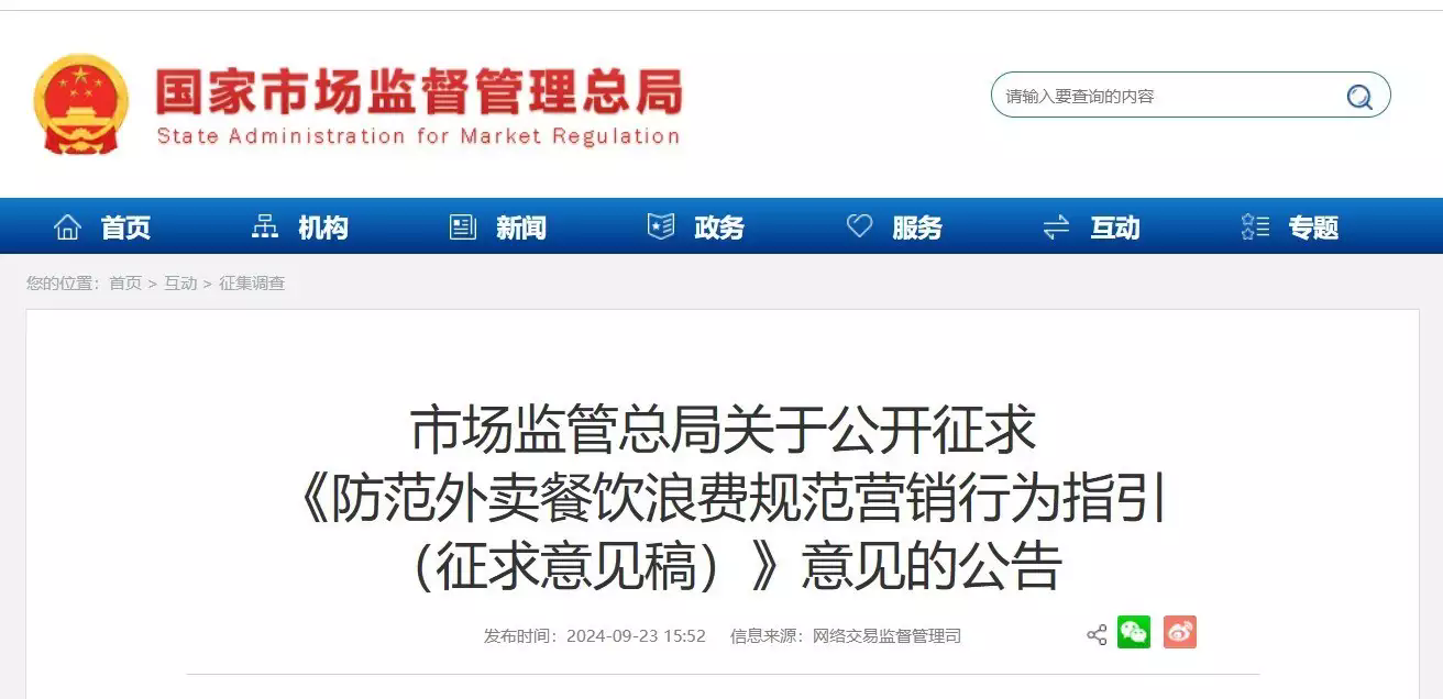 市場監(jiān)管總局 9 月 23 日發(fā)布公告,公開征求《防范外賣餐飲浪費(fèi)規(guī)范營銷行為指引(征求意見稿)》(下稱《征求意見稿》)意見。市場監(jiān)管總局鼓勵外賣商家合理設(shè)置起送價格并積極提供小份餐品具有多方面的積極意義。