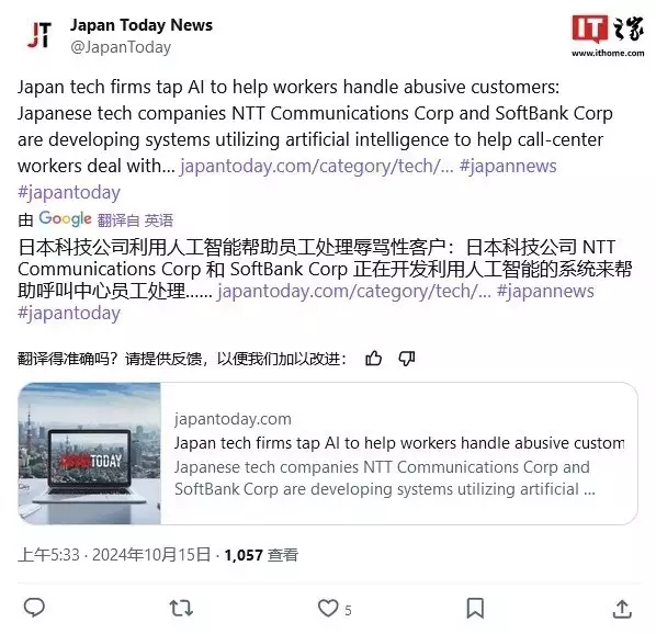 10 月 18 日消息,《今日日本》于 10 月 15 日發(fā)布博文,報道稱 NTT 通訊公司和軟銀公司正開發(fā) AI 系統(tǒng)能夠,以幫助客服應(yīng)對惡劣客戶。在當(dāng)今社會,