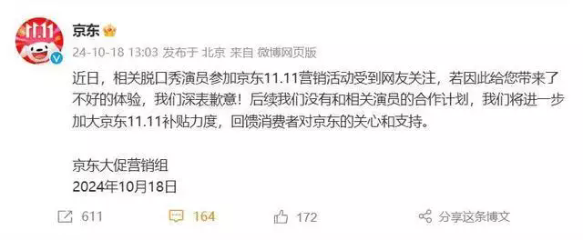 2024 年 10 月 18 日中午,京東大促營銷組發(fā)布聲明稱,相關(guān)脫口秀演員參加京東 11.11 營銷活動受到網(wǎng)友關(guān)注,若給用戶帶來不好體驗(yàn),深表歉意,并且后續(xù)沒有和相關(guān)演員的合作計劃。