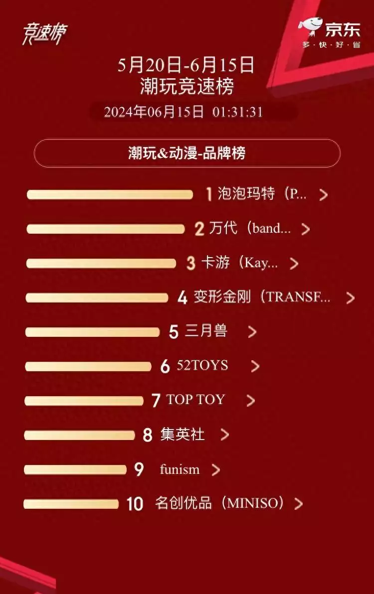 今年京東618期間,玩具成為了最受關(guān)注、增速最快的品類之一。以下是京東超市發(fā)布的618玩具樂器品類競速榜單中銷量排名第一的品牌: 潮玩