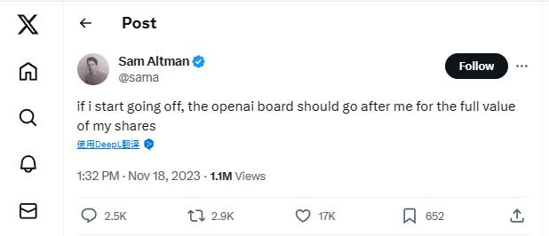 在OpenAI公司內(nèi)部,一場關(guān)于是否應該“開火”的爭論正在上演。 當?shù)貢r間2月15日,阿爾特曼在推特上回應了OpenAI聯(lián)合創(chuàng)始人兼CEO山姆·阿爾特曼(Sam Altman)周三的一條推文。