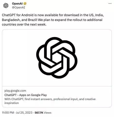 7月26日訊,OpenAI經(jīng)過其官方推特宣告,安卓版ChatGPT現(xiàn)在在美國、印度、孟加拉國和巴西供給下載,并計(jì)劃在下周將其推行至更多國家。