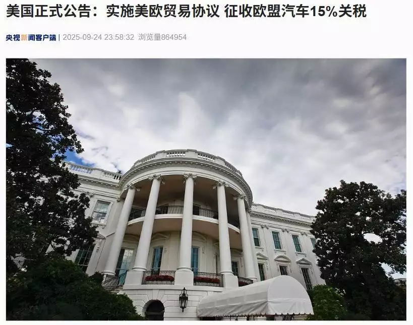 美國(guó)商務(wù)部與貿(mào)易代表辦公室于當(dāng)?shù)貢r(shí)間9月24日發(fā)布聯(lián)合公告,正式確認(rèn)對(duì)歐盟進(jìn)口汽車(chē)及汽車(chē)產(chǎn)品征收15%的關(guān)稅,此決定將追溯至2025年8月1日起生效。