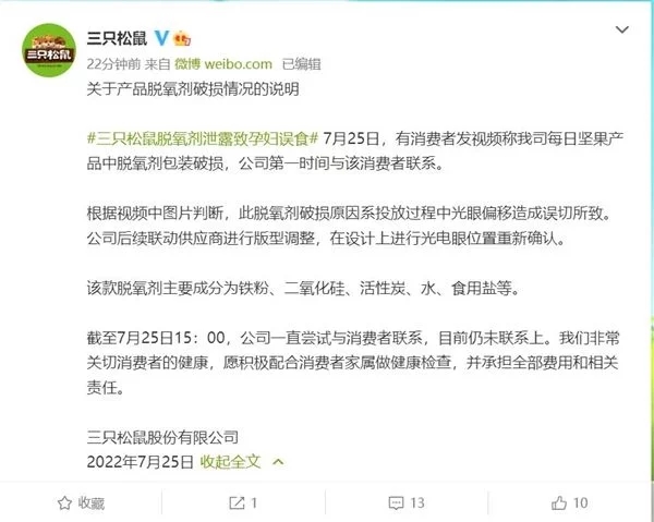 7月25日消息,一位顧客發(fā)視頻稱懷孕的老婆吃了半包三只松鼠堅(jiān)果后,發(fā)現(xiàn)食品袋中的脫氧劑泄露。對(duì)此,三只松鼠稱此脫氧劑破損原因系投進(jìn)過(guò)程中光眼偏移形成誤切所造成的。