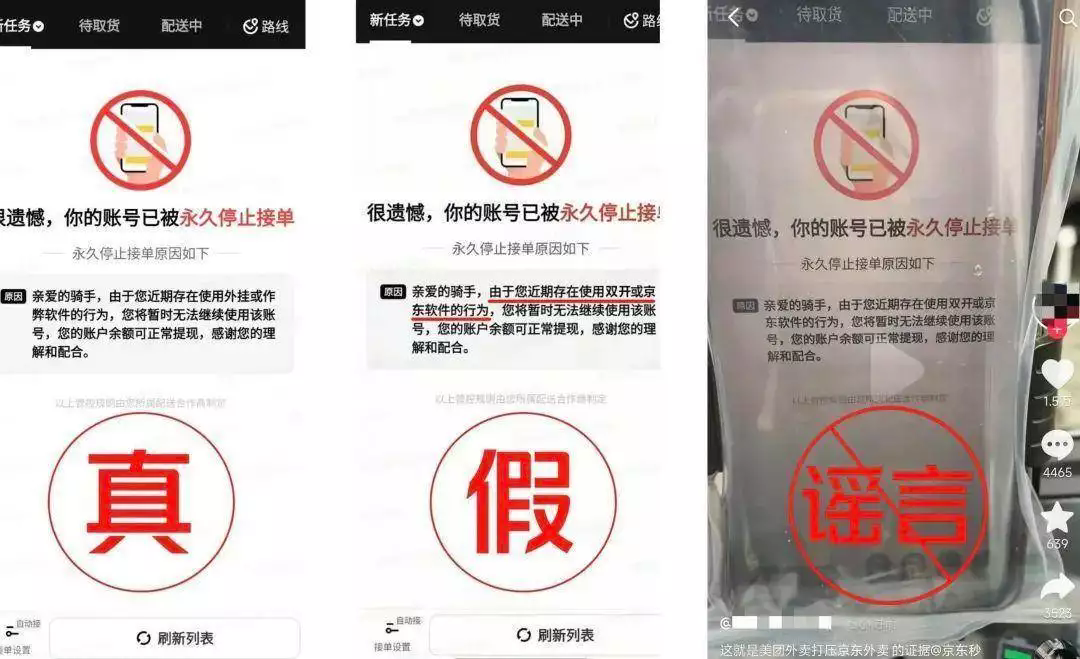 美團(tuán)4月27日在其官方公眾號(hào)“小團(tuán)有話說”發(fā)布聲明稱,在澄清“去其他平臺(tái)跑單會(huì)被美團(tuán)永久封號(hào)”的謠言后,社交平臺(tái)上依舊出現(xiàn)了騎手App顯示“永久停止接單原因?yàn)椋捍嬖谑褂秒p開或京東軟件的行為”的謠言圖片。