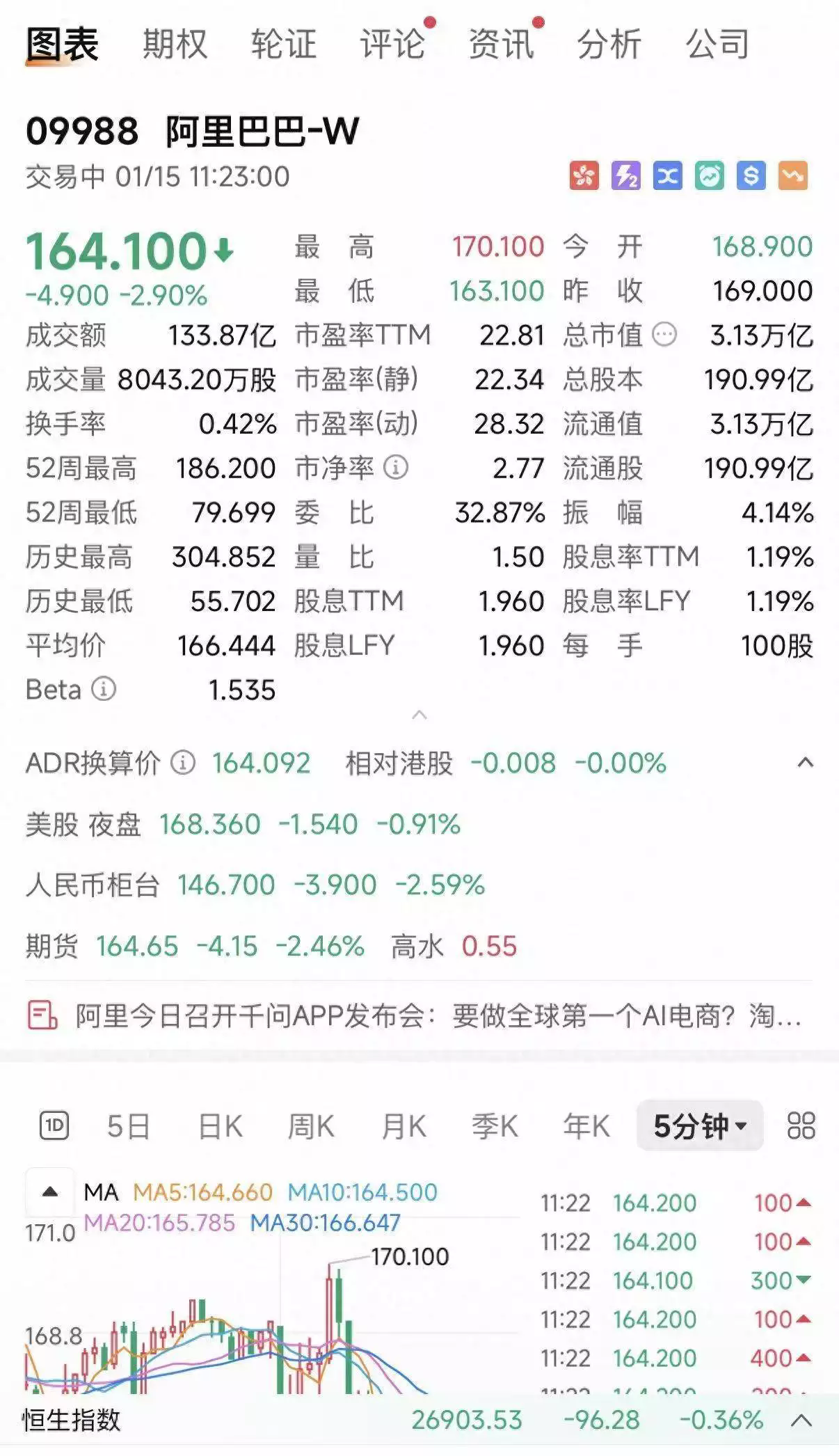 阿里巴巴港股今日(以您看到信息的時(shí)間為基準(zhǔn),通常指最近一個(gè)交易日)下跌近3%,這通常是市場(chǎng)對(duì)公司近期動(dòng)態(tài)、行業(yè)環(huán)境或宏觀(guān)經(jīng)濟(jì)因素的直接反應(yīng)。