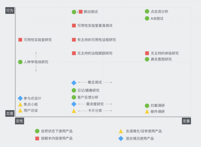 其實(shí)用戶體會(huì)研討辦法有許多,這兒給咱們說(shuō)四點(diǎn),便是咱們能夠從四個(gè)維度——情緒VS行為、定性VS定量、運(yùn)用場(chǎng)景以及產(chǎn)品開發(fā)所在的階段來(lái)進(jìn)行考慮。 下圖是最常用的20種用戶研討辦法的散布: