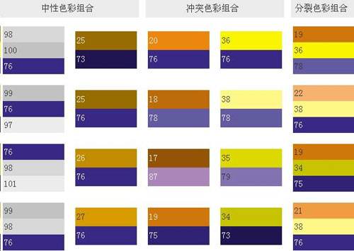 純藍和一些紅色結(jié)合在一起會發(fā)生藍紫色的感覺,這是色相環(huán)上最深的顏色。這類顏色調(diào)配可象征權威,表現(xiàn)出皇家的氣度,就象夏日的梅子,有莫測高深的藍黑,藍紫和它的補色——黃橙調(diào)配起來,