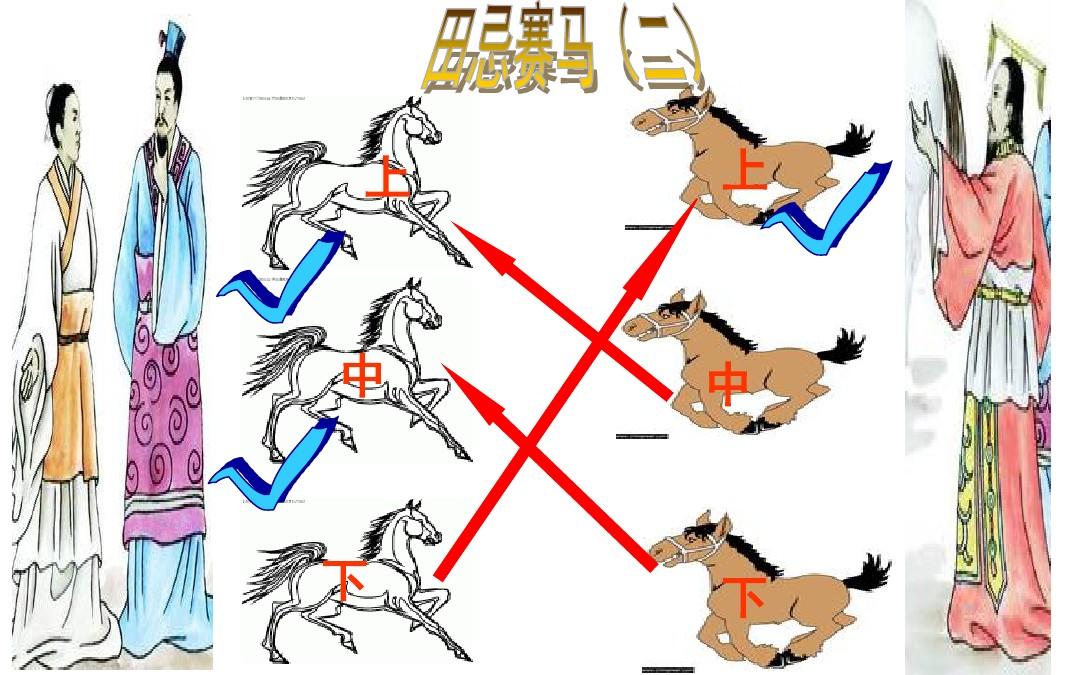 田忌賽馬的故事大家一定都聽說過,用自己的下等馬和對(duì)方的上等馬競(jìng)賽,用上等馬和對(duì)方的中等馬競(jìng)賽,用中等馬和對(duì)方的下等馬競(jìng)賽,這樣就可以在三局的競(jìng)賽中獲得勝利。